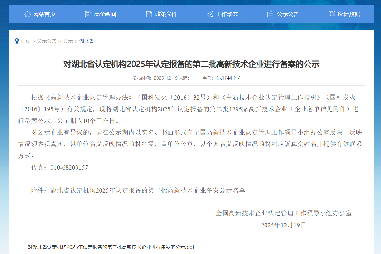 2025年度的认定工作自年初启动,企业需严格按照《高新技术企业认定管理办法》等相关规定,经过严谨的自我评价、材料申报、合规审查与专家评审等多重环节,最终报国家层面备案公示。此次成功认定,是省科学技术厅、省财政厅、国家税务总局湖北省税务局等主管部门对公司科技创新成果与发展潜力的高度认可。